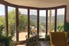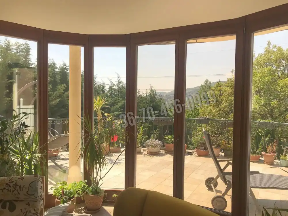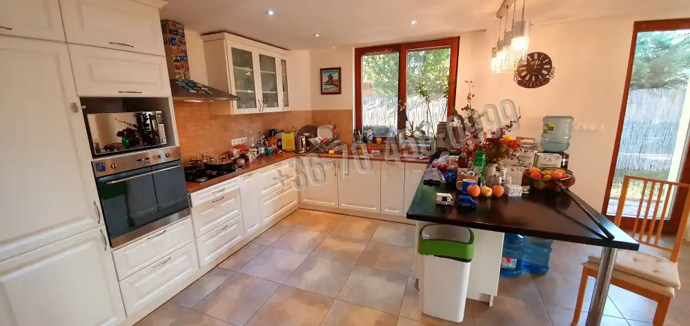 A szerkezetileg kitűnően megépített ingatlan nappali szintjéhez hatalmas teraszok kapcsolódnak, a ~80 nm-es nappali-konyha-étkező együtteséből közvetlenül is, ill. a hozzá kapcsolódó ~50 nm-es teraszról is élvezhetjük a zavartalan panorámát. A hátsó, ~100 nm-es terasz a gyümölcsfákkal beültetett, gyepesített, hangulatos kertben folytatódik. Ezen a szinten találunk még két kényelmes hálószobát, zuhanyzóval felszerelt fürdőszobát és vendégmosdót is. A kényelmes, - impozáns kovácsoltvas korláttal ellátott, az ablakoknak köszönhetően világos - belső lépcsőházban juthatunk fel a három hálószoba szintjére, itt a minden igényt kielégítő fürdőszoba mellett az intim fekvésű, panorámás terasszal bíró szülői hálószobából külön járható gardrób is a lakók kényelmét szolgálja. A rendkívül tágas két lakószintet kiegészíti a beépített, teljes értékű, klimatizált manzárd szoba, ami tökéletes lehetőség lehet az elvonulásra, kikapcsolódásra.