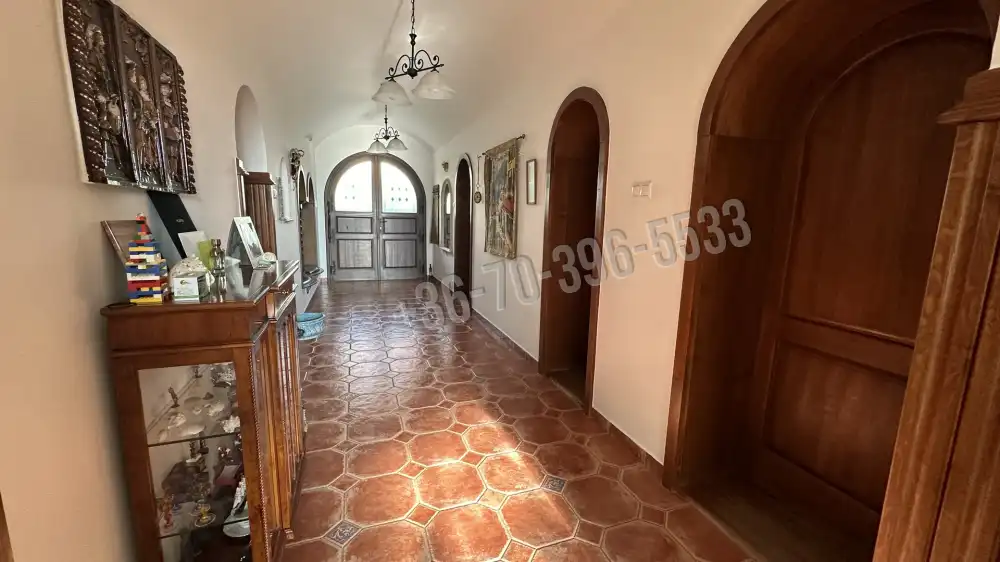 A bejárati ajtón belépve hosszas és tágas folyosó fogad melynek jobb oldalán beépített boltíves bőrrel borított ülőhely, ahol kényelmesen le lehet ülni a cipőt levenni. Az előszoba kővel borított, belső ajtók mind boltívesek, ballra található dolgozószoba, mellékhelyiség, vendégszoba fürdőszobával, jobbra a lépcsőház szemben pedig az 52 nm-es, 3,35 m-es belmagasságú, napfényes, tágas nappali.