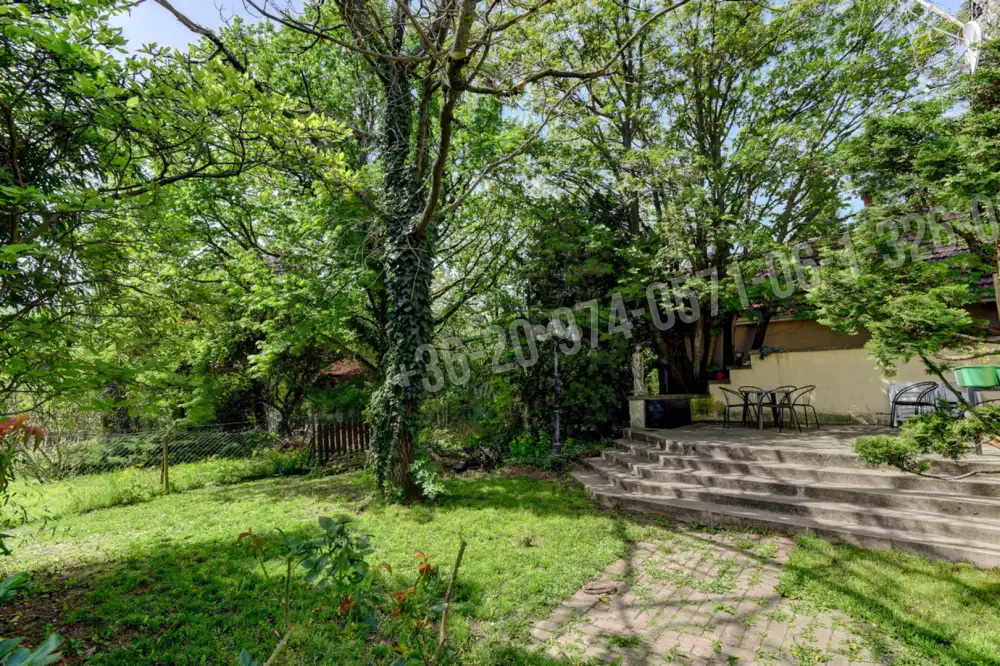 36 m²-es különálló utcafronti épület, benne 24 m²-es garázs (3 méteres belmagassággal) és 12 m²-es tároló. Szép, parkosított 941 m²-es telek, árnyas fákkal, bokrokkal, pázsittal, kis halastóval.