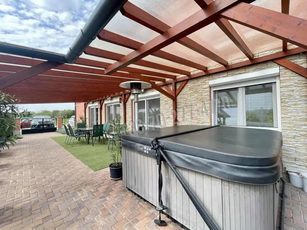 A körbekerített, rendezett udvarba kovácsoltvas kapun keresztül érkezünk. A fedett teraszon találjuk a kültéri jakuzzit, a grill sütőt, a kerti bútorokat. Az udvar parkosított és térkővel burkolt. A ház mögött egy négy helyiségből álló 36 m2-es melléképület található.