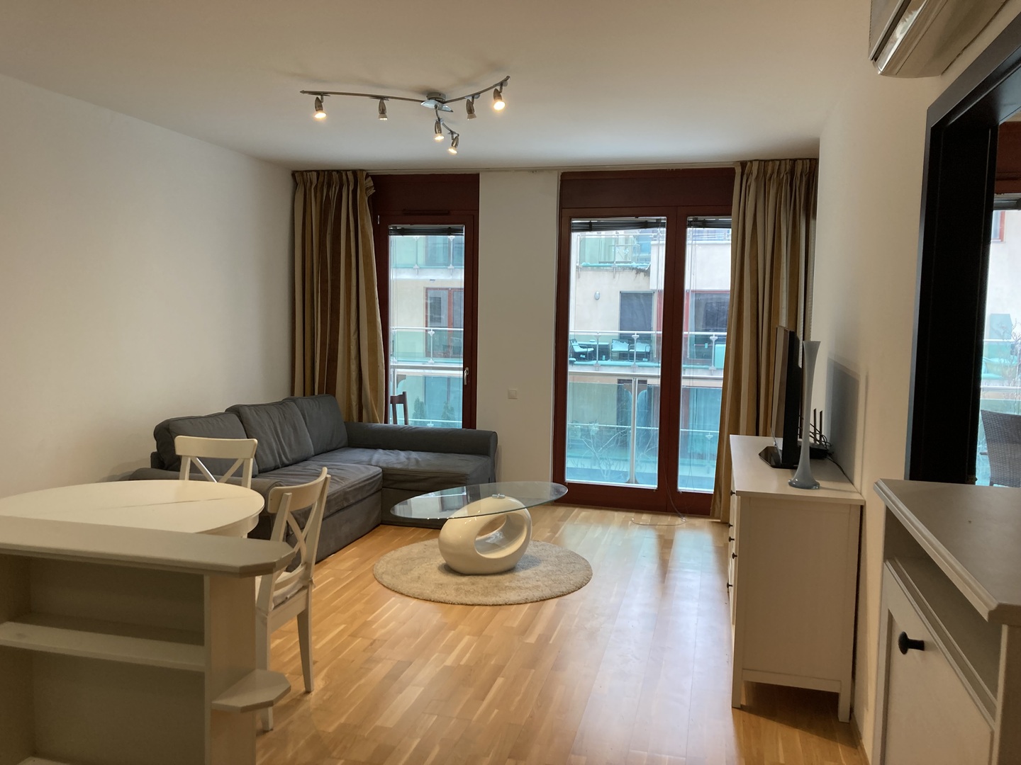 A lakás helyiségei tágasak, jól berendezhetőek. A nagy ablakokkal rendelkező, világos nappali egy légtérben van a pulttal elválasztott konyhával, ami teljesen gépesített, beépített konyhabútorral rendelkezik.