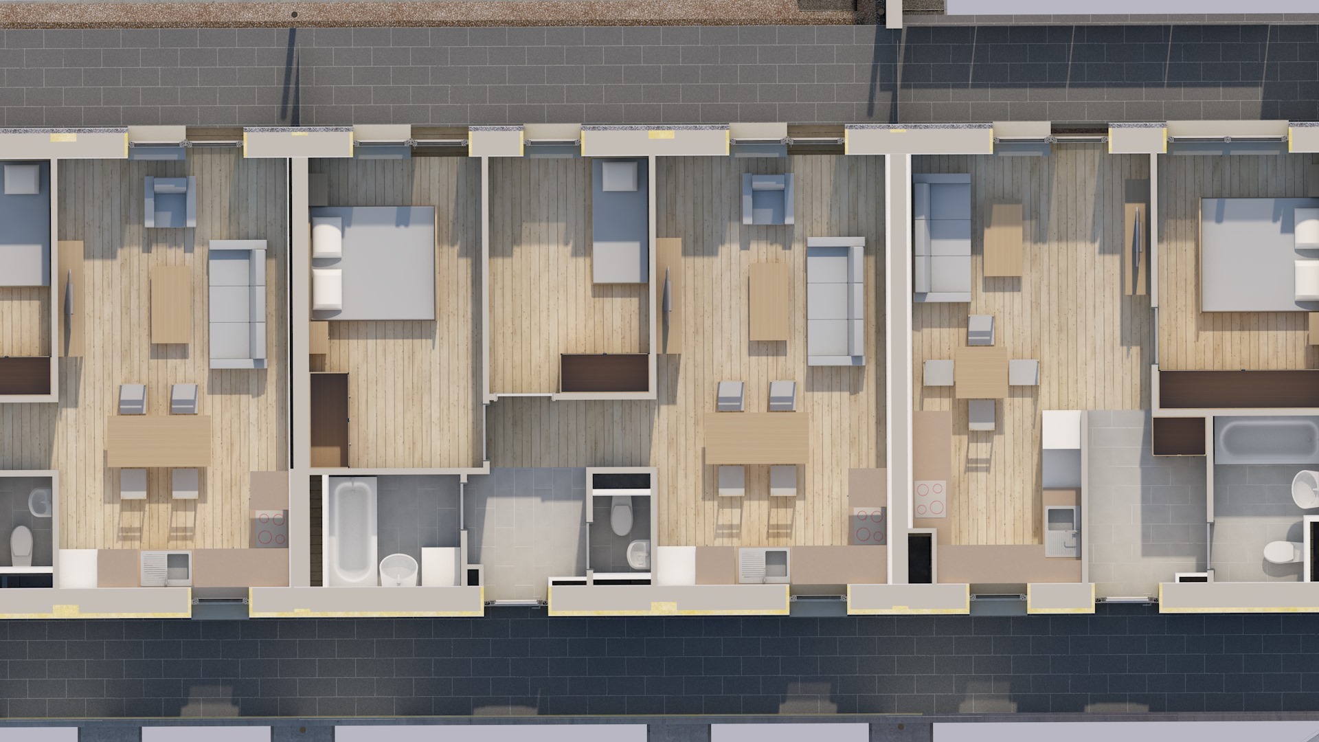 A modern megjelenés, a gondosan kialakított közös terek és a minőségi anyaghasználat egy rendezett, kényelmes mindennapokat biztosító otthont eredményez.